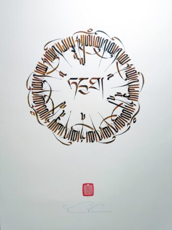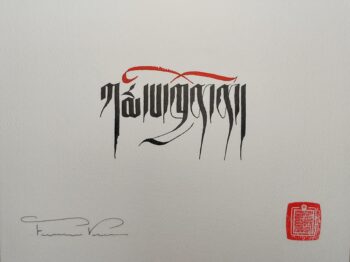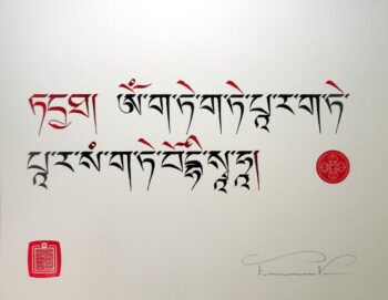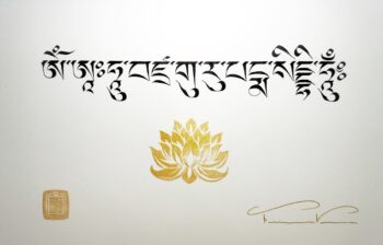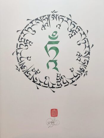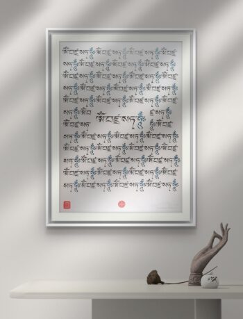 This piece features the Mantra of Guru Padmasambhava: OM AH HUNG VAJRA GURU PADMA SIDDHI HUNG.