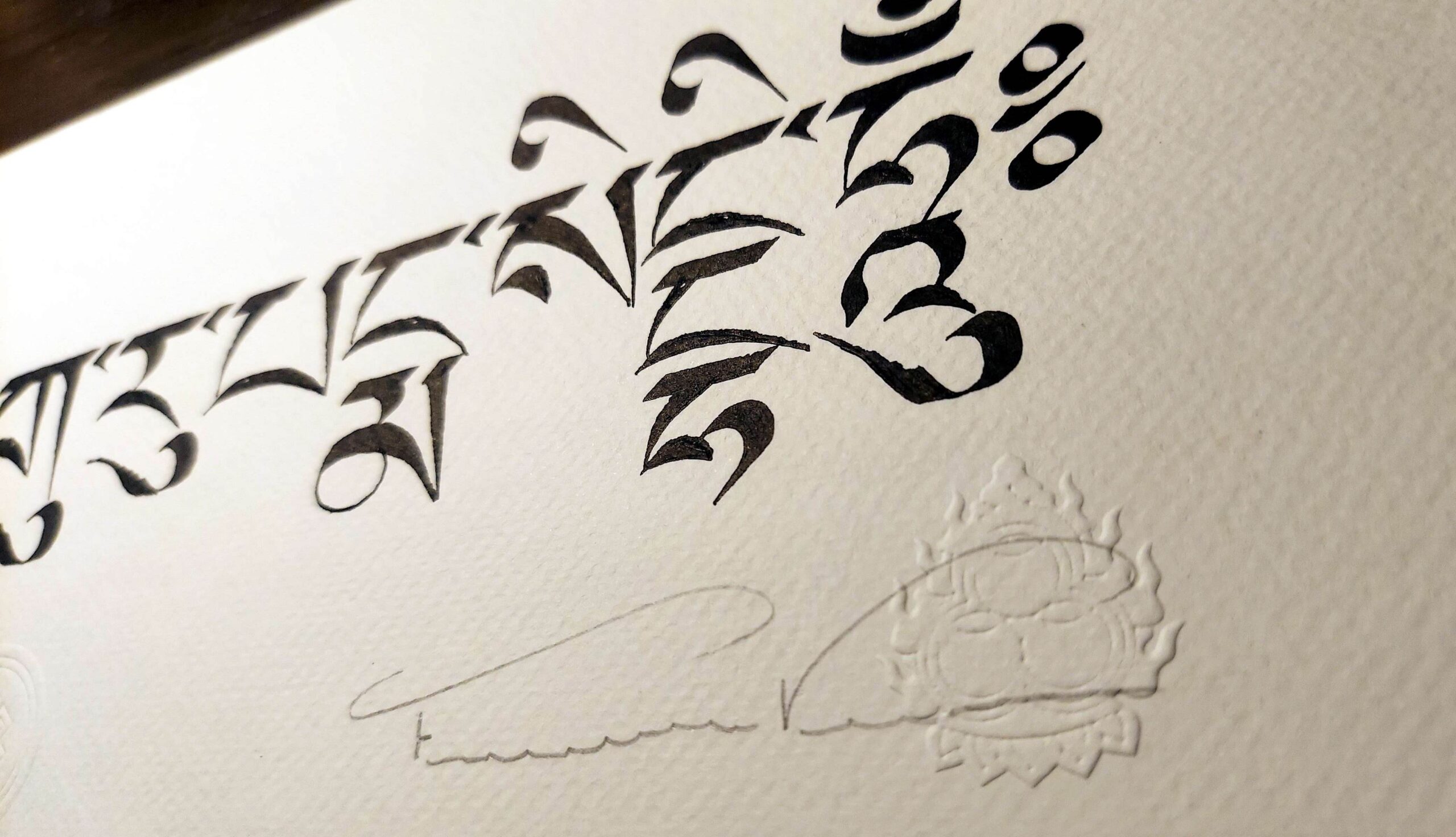 This piece features the Mantra of Guru Padmasambhava: OM AH HUNG VAJRA GURU PADMA SIDDHI HUNG.