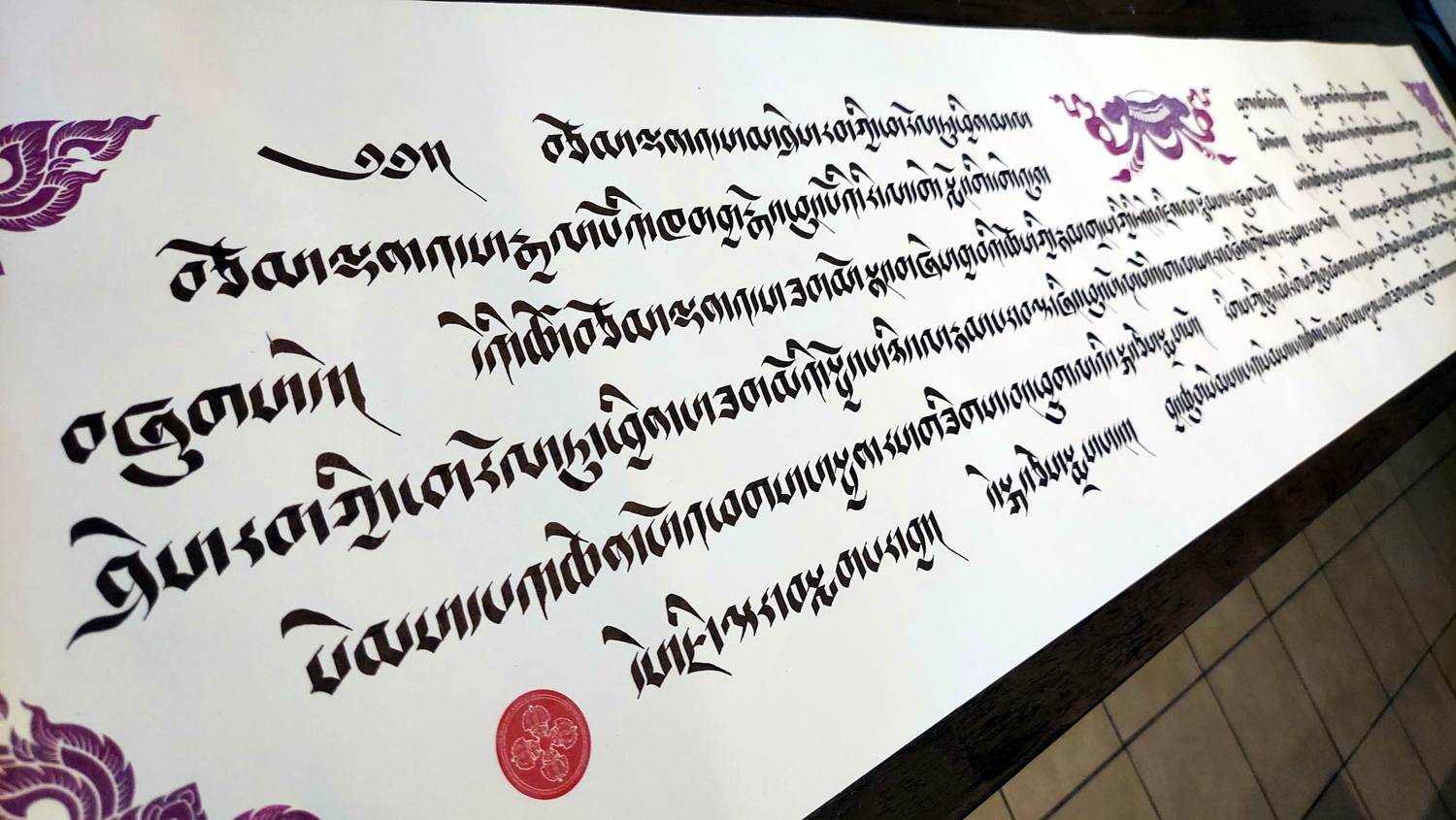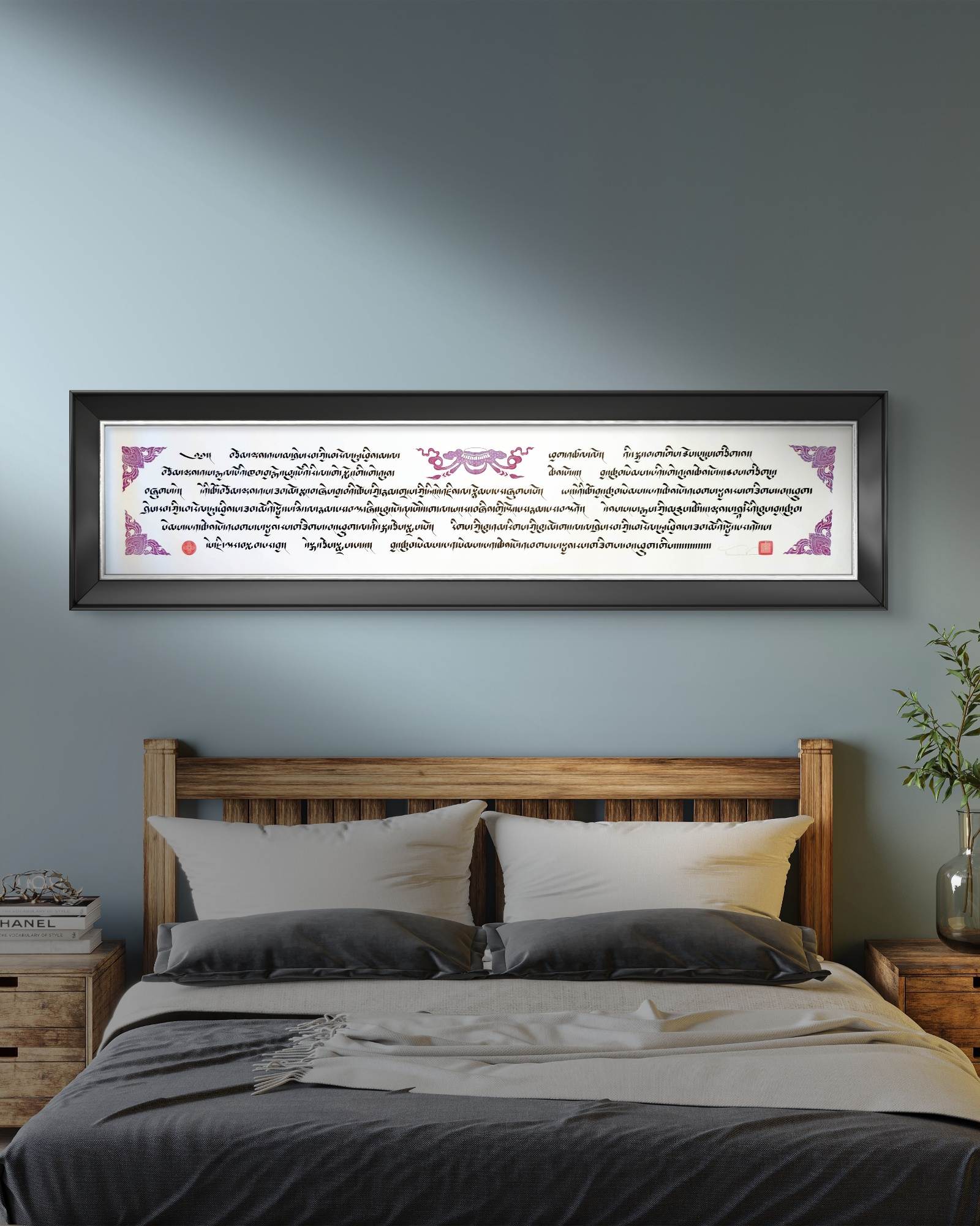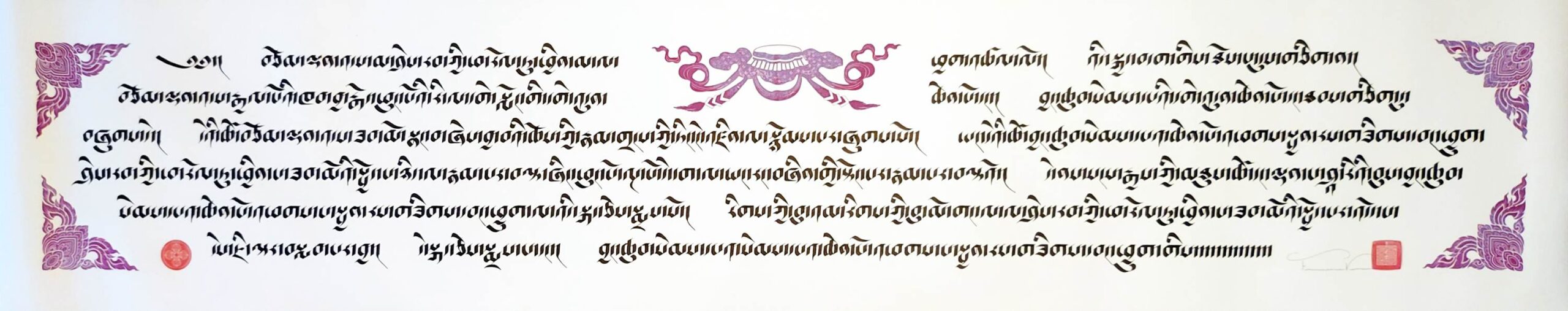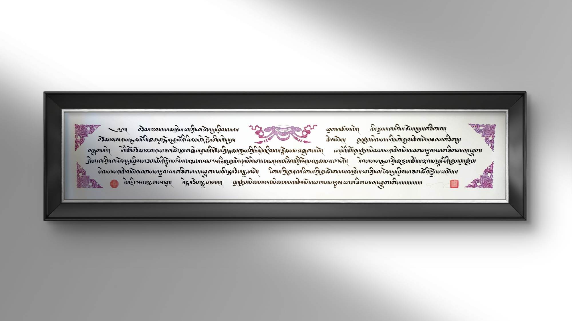 This is piece features a portion of the Heart Sutra. The Heart Sutra is one of the most profound and concise scriptures in Tibetan Buddhism, encapsulating the essence of *Prajñāpāramitā* (Perfection of Wisdom). It teaches the doctrine of *Śūnyatā* (emptiness), emphasizing that all phenomena lack inherent existence. Central to the sutra is the phrase, “Form is emptiness, emptiness is form,” illustrating the inseparability of appearance and emptiness. In Tibetan Buddhism, the *Heart Sutra* is recited for purification, insight, and overcoming delusion. It is a key text for developing wisdom and realizing the true nature of reality.