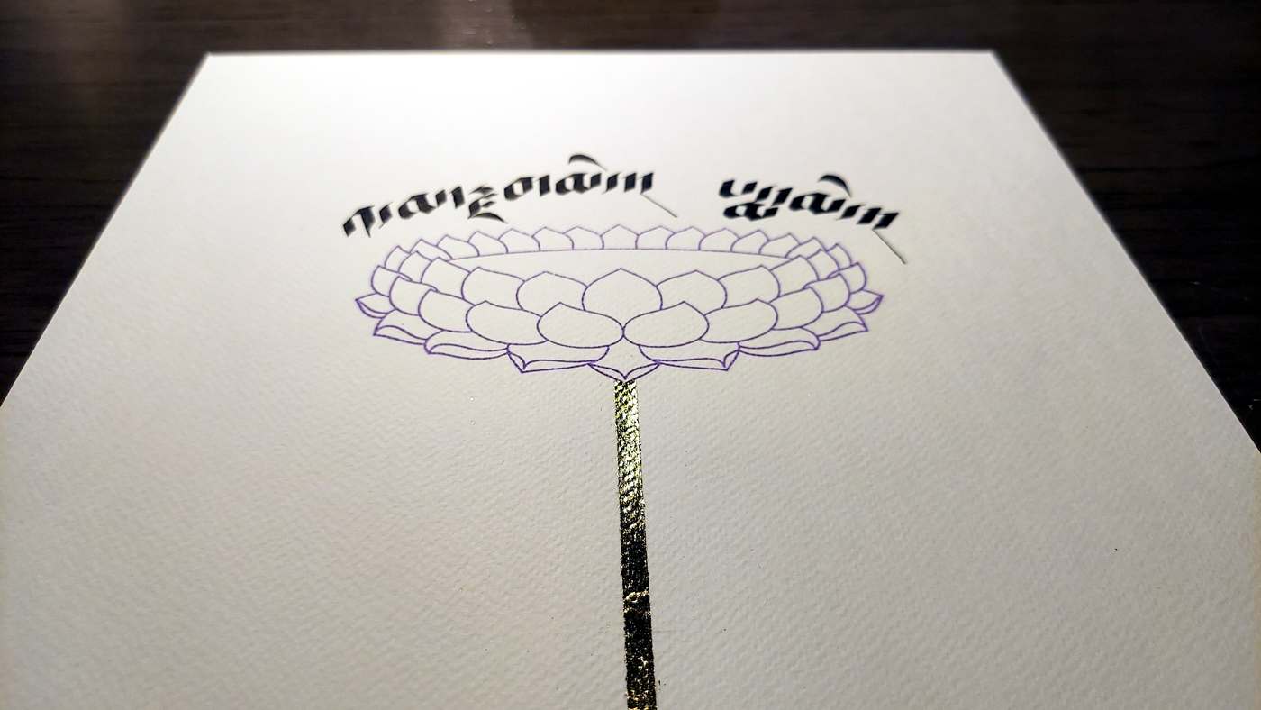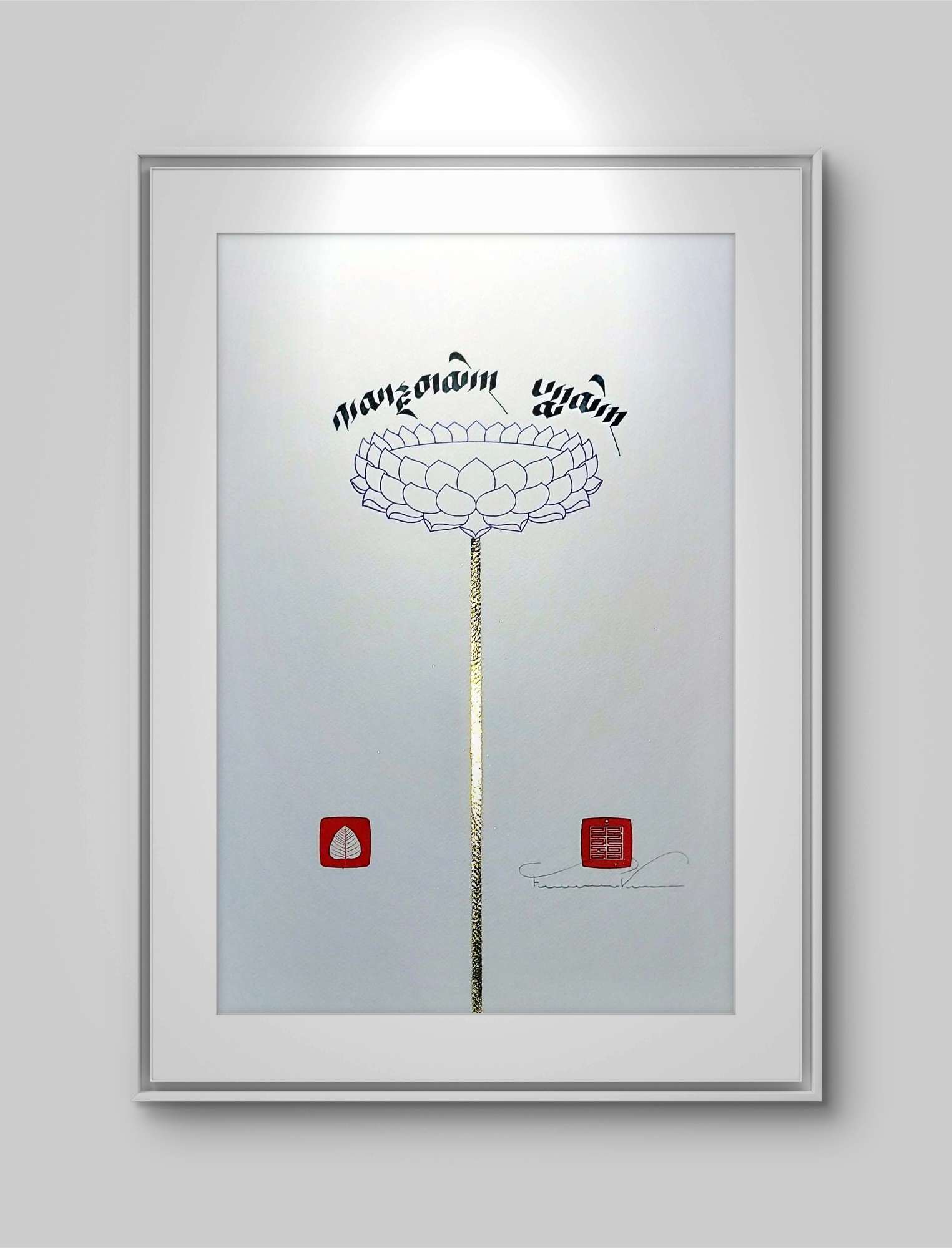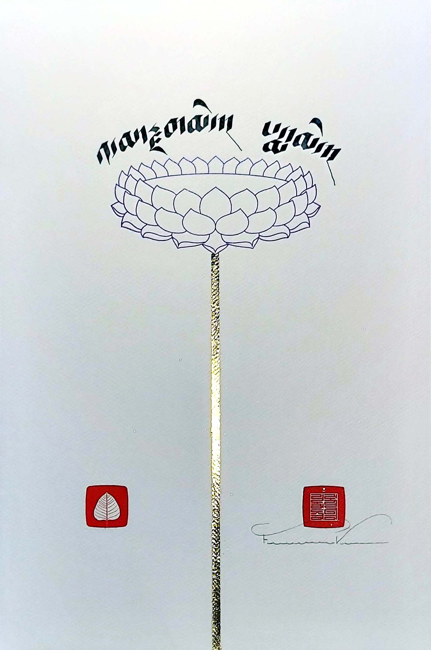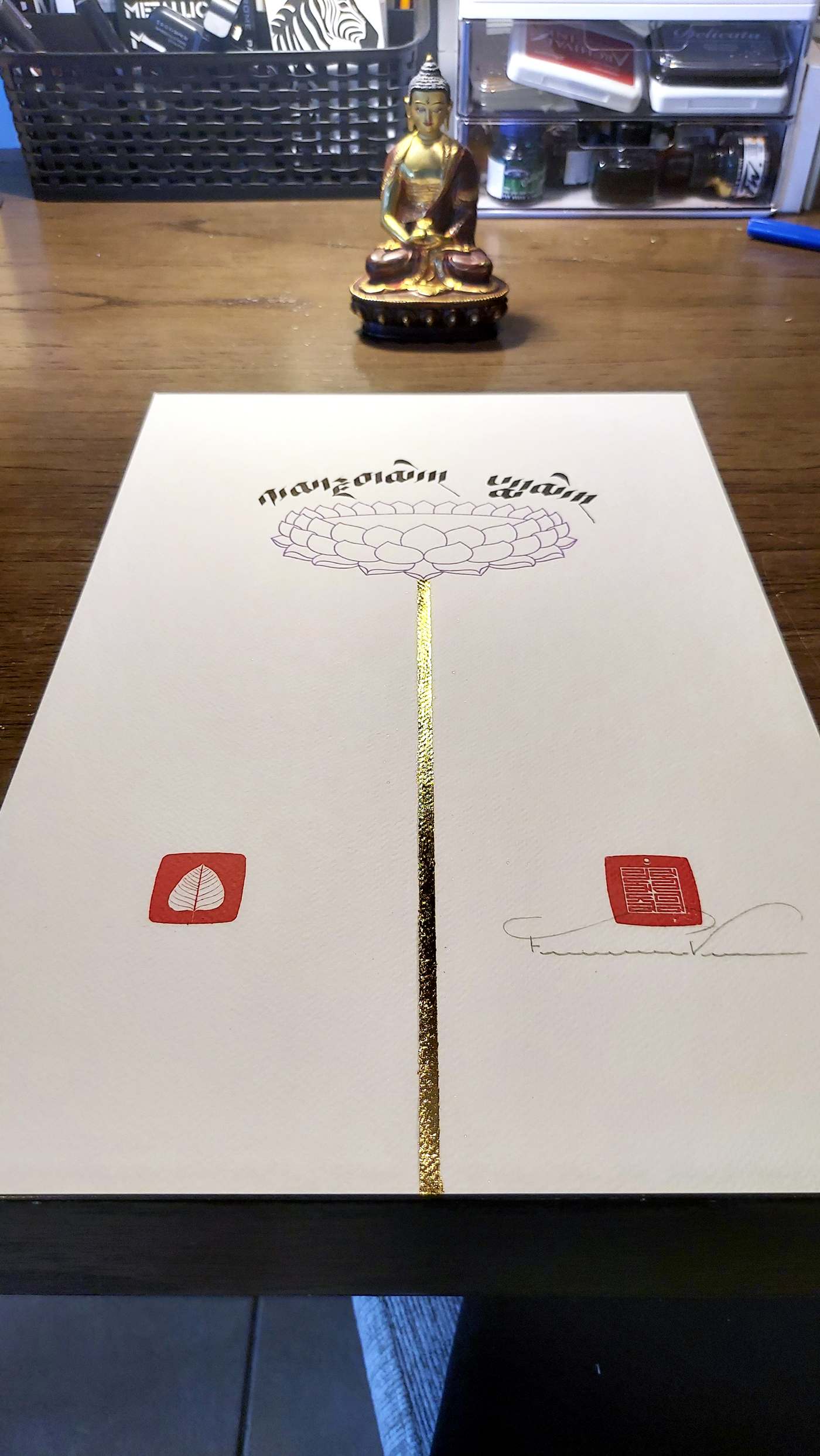 This piece is was written in the Petsug script. I incorporated gold leaf for the flower’s stem. Below are my personal seal as well as a stamp of a bodhi tree leaf.