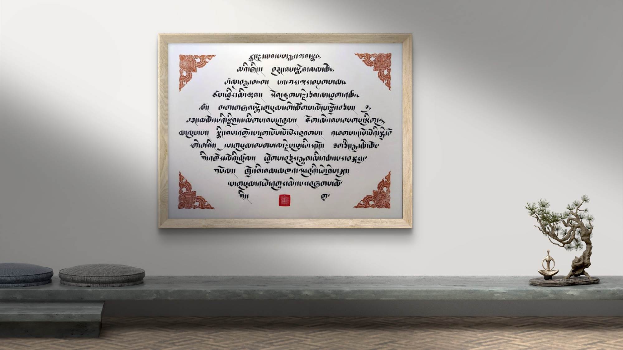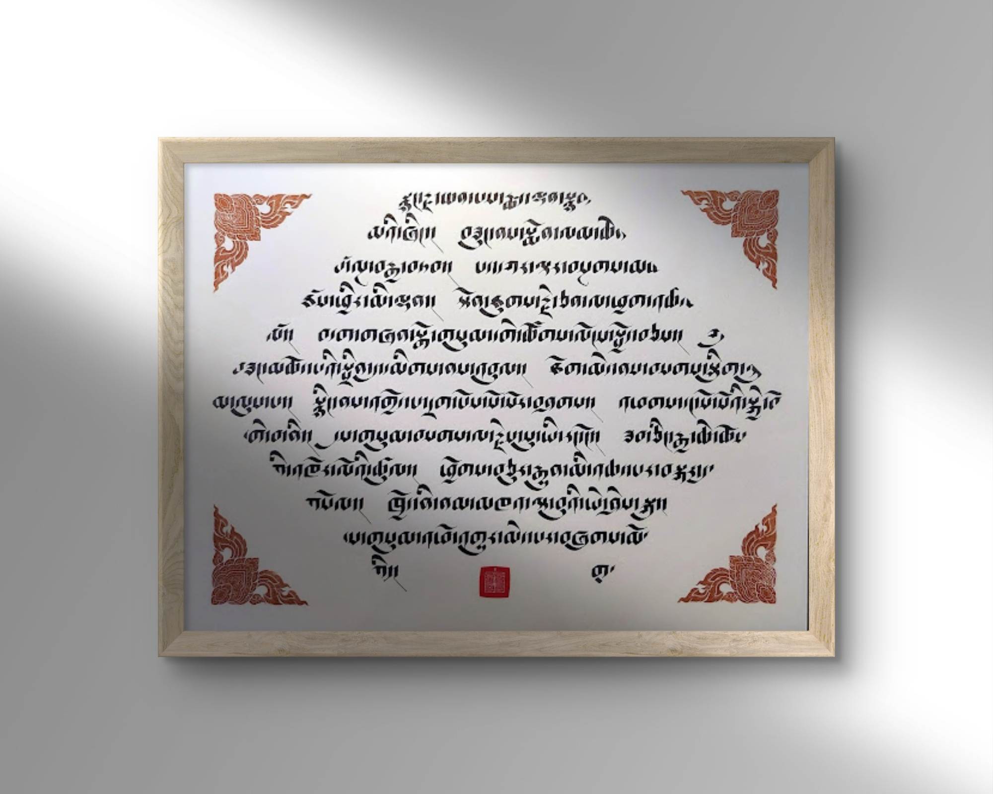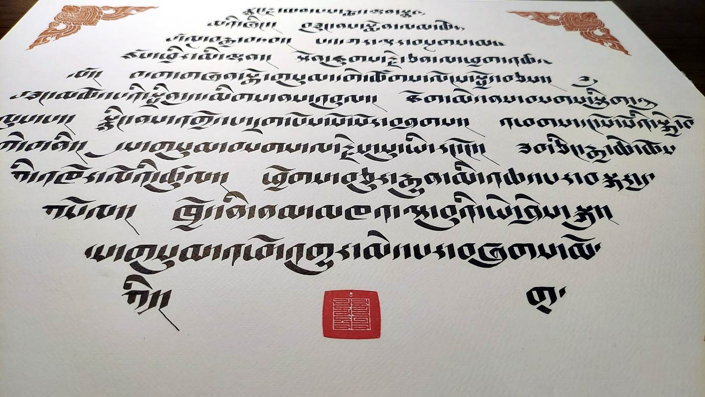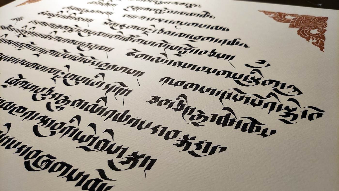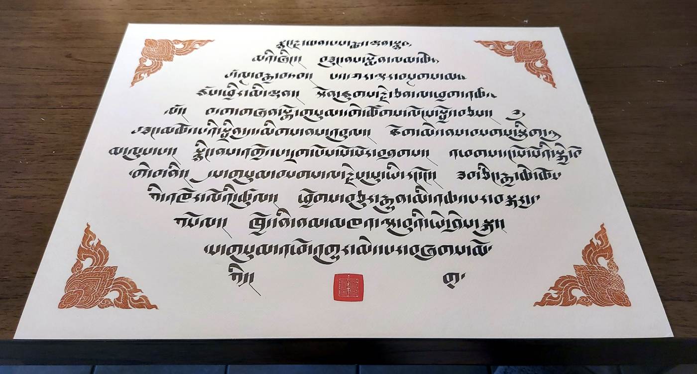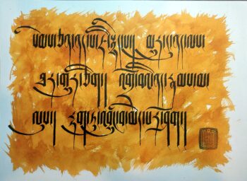 This work features an excerpt from The Seven-Branch Prayer to Buddha Shakyamuni. This is a classic Mahayana practice that accumulates merit and purifies obscurations. The seven branches (or limbs) are: prostration, offering, confession, rejoicing, requesting to turn the wheel of Dharma, requesting to remain, and dedication.